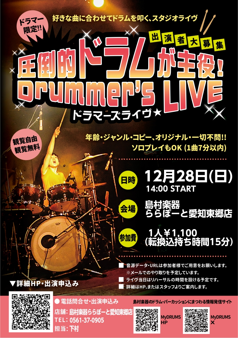 CONTENTSドラマー限定!【圧倒的ドラムが主役!第2回ドラマーズライヴ】イベント詳細お申し込みはこちらドラマー限定!【圧倒的ドラムが主役!第2回ドラマーズライヴ】 「ドラマー」が主役の「ドラムプレイを披露」する「スタジオライヴ」を開催します!参加料金はお1人¥1,100で持ち時間は15分。持ち時 […]