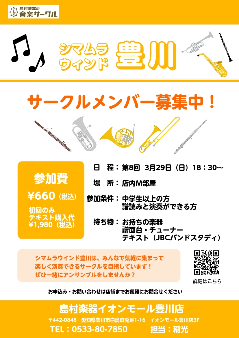 ![皆さまこんにちは!管楽器担当の稲光と佐藤です🎺 12月28日(日)に第7回目の活動を行いました!今回は新メンバーも加入して、年内最後の活動を行いました!2025年も大変お世話になりました。今年もどうぞよろしくお願いいたします。みなさまご家庭やお仕事などお忙しいなかで、無理のないようにご参加いただいて […]](https://www.shimamura.co.jp/shop/toyokawa/wp-content/uploads/sites/210/2026/01/20260102-594067886243316040.jpg)