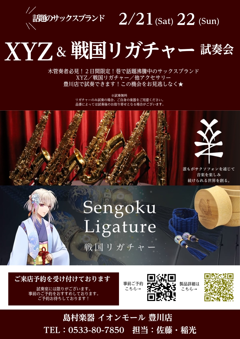 みなさまこんにちは!豊川店、管楽器担当の佐藤です🌸2月21日(土)・22日(日)2日間限定で、巷で話題のサックスブランド「XYZ」のフェアを開催いたします!なんと!大人気の「戦国リガチャ―」も展示予定です!木管奏者のみなさま!ぜひこの機会をお見逃しなく! CONTENTSXYZとは?アルトサックスS […]