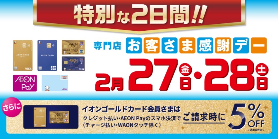 2月は特別にお客様感謝デーが2日間です!イオンゴールドカードでのお買い物でご請求時5%OFF!