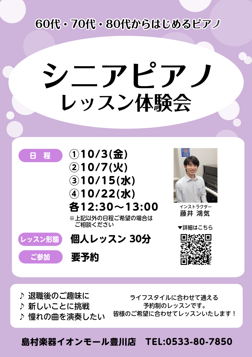![CONTENTS体験会内容ピアノレッスンのポイントレッスンの様子まずはお気軽にお問い合わせ下さい体験会内容 みなさんこんにちは。島村楽器イオンモール豊川店 藤井です。当店の大人のためのピアノ教室「ピアノサロン」では、シニアピアノレッスン体験会を実施中です。 シニア世代からピアノを始める方を応援してい […]](https://www.shimamura.co.jp/shop/toyokawa/wp-content/uploads/sites/210/2025/07/20250702-9a3cb6209b047c982a403a3ee0f0e2b5.jpg)
