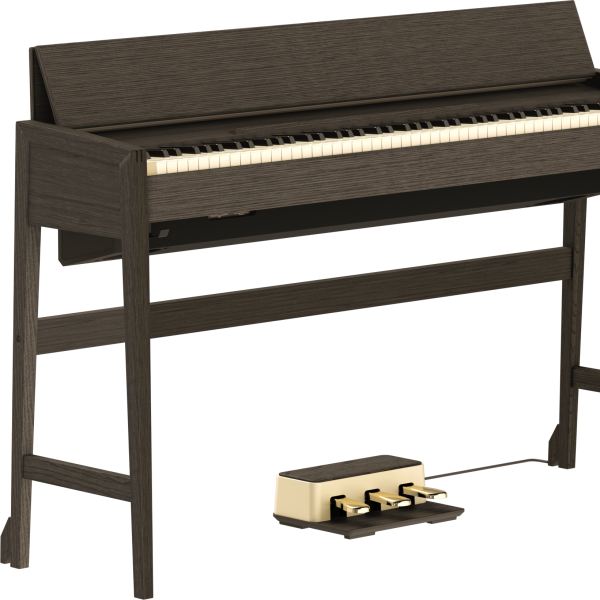発売から10周年を迎える今年、島村楽器限定の「KF-25」が登場。直線基調の端正なデザインと、上質感漂う「スモークドオーク色」を採用したモデルです。ローランド最新のデジタルピアノ技術を搭載し、デザインの美しさと、ピアノとしての演奏性能の両立を実現しました。