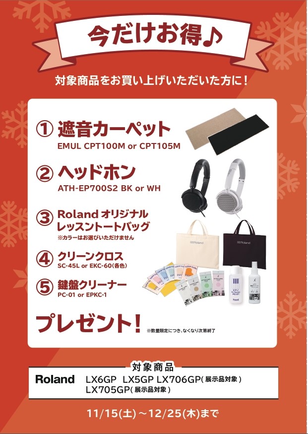 | LX9、LX6、LX5 KF-10、HO704 DP603 | ①開放型ヘッドホン(ATH-EP300S2 WH) ②トートバッグ(ローランドオリジナル) ③クリーンクロス(SC-45L or EKC-60各色) ④鍵盤クリーナー(PC-01 or EPKC-1) |