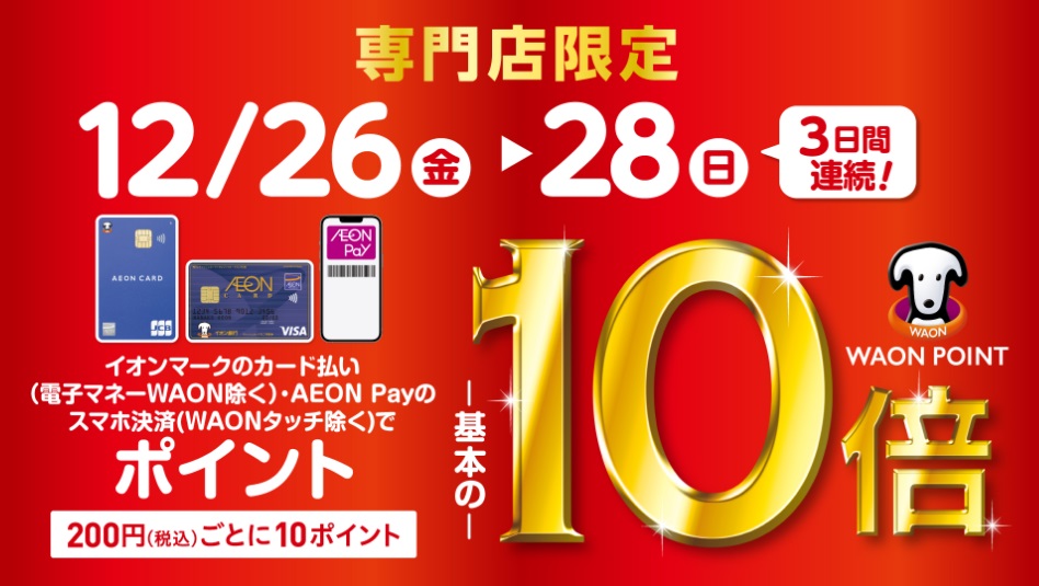 12/26(金)~28(日)イオンカード払い・AEON Payのスマホ決済でWAON POINT 基本の10倍!!