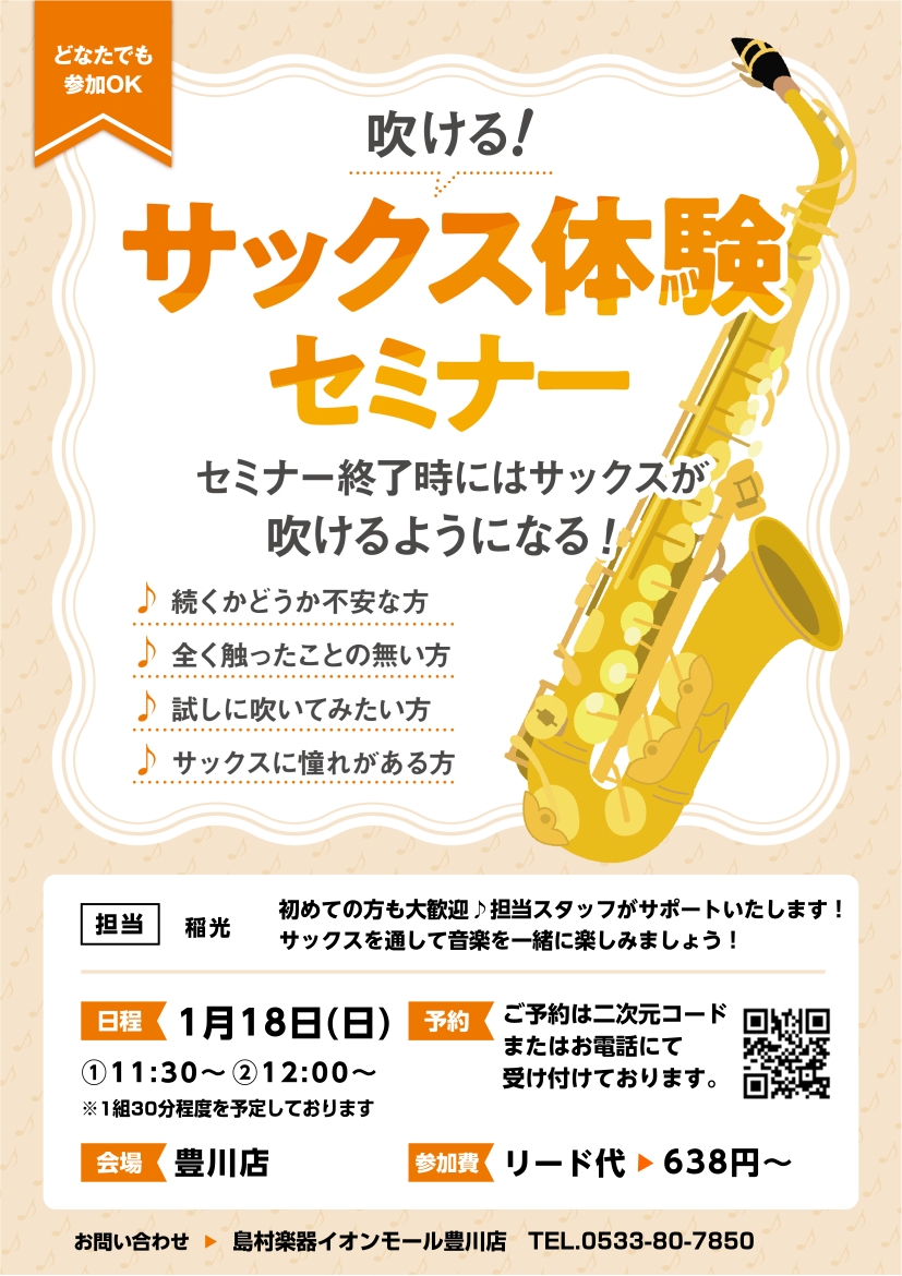 | セミナーについて | これからサックスを始めたい! という方向けのセミナーとなります。 演奏技術向上のためのレッスンではない為、ご注意ください。 |