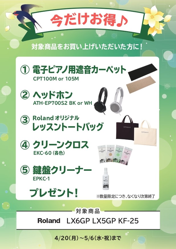 | LX9,LX6,LX5,HP704,DP603,KF-10 | ①EMULカーペット※5/6(水)まで ②ヘッドホン(ATH-300S2) ③オリジナルトートバッグ ④クリーンクロス ⑤鍵盤クリーナー |