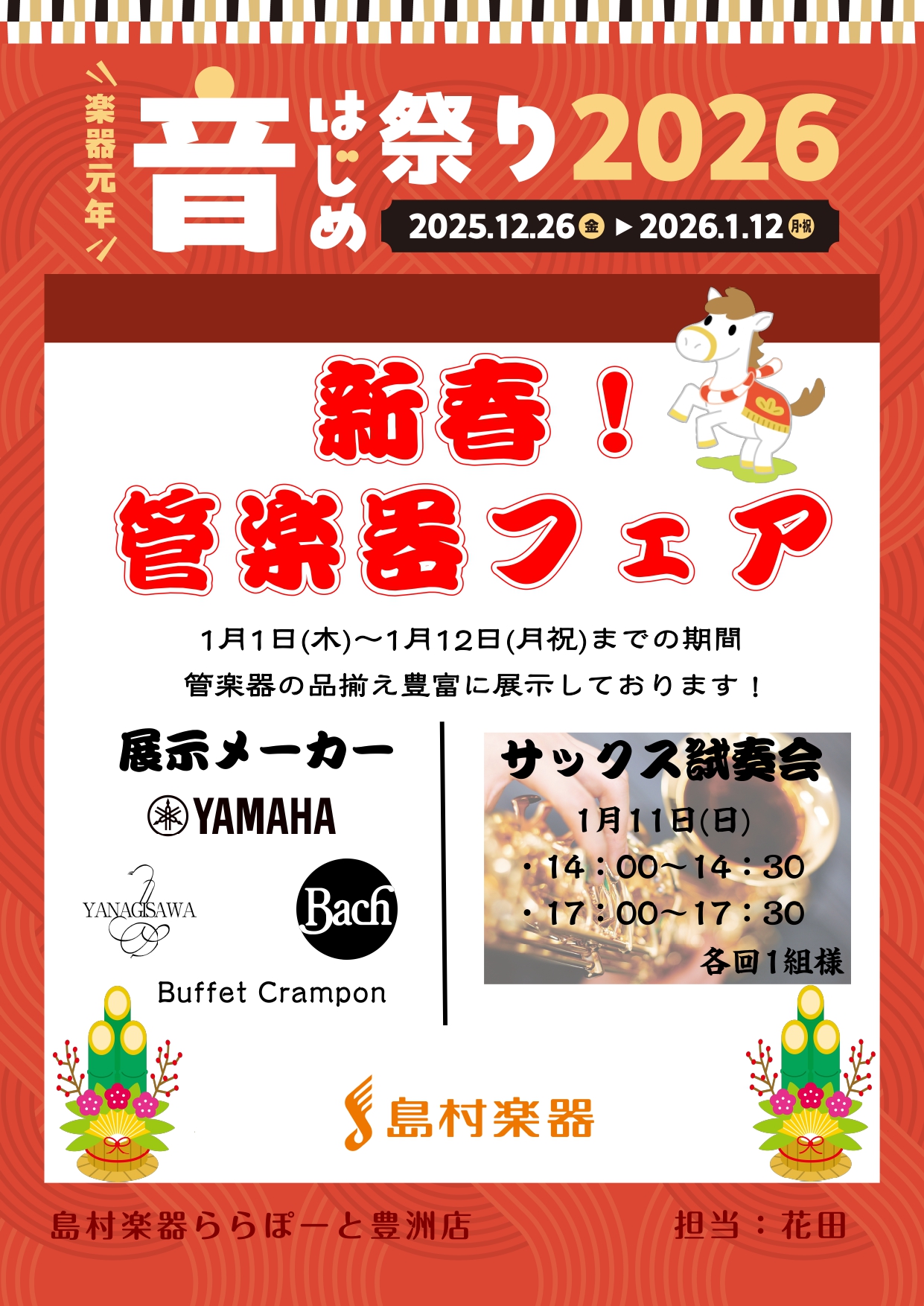 明けましておめでとうございます!島村楽器ららぽーと豊洲店の管楽器アドバイザー、花田です!1月1日(木)~1月12日(月祝)の期間、ららぽーと豊洲店では管楽器フェアを開催いたします。通常のラインナップに加えて今回はサックスで人気のあるメーカー、『yanagisawa』のアルトサックス・テナーサックスを […]