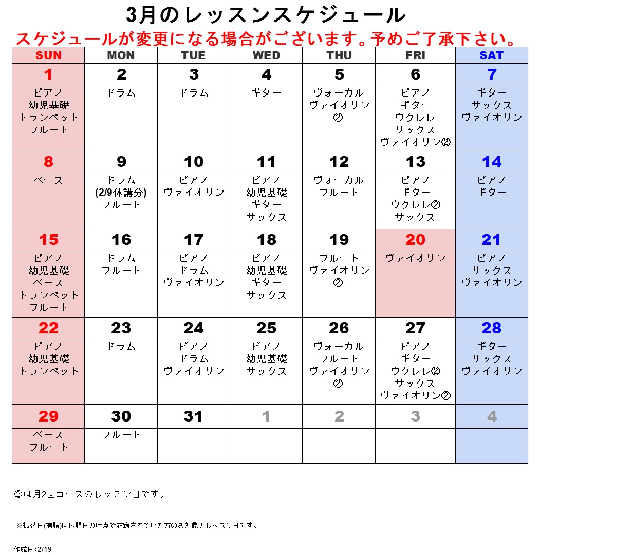 ☆音楽教室☆2026年3月のスケジュール♫