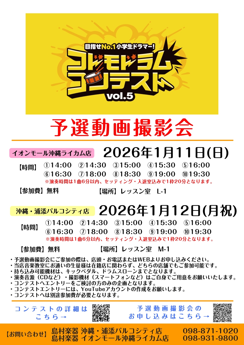 九州・沖縄の小学生ドラマーの皆様!毎年、好評いただいております!今回で5回目の開催となるコドモドラムコンテストですが、なんと沖縄大会が2026年2月8日(日)に開催されます!場所はイオンモール沖縄ライカム グランドスクエア(大水槽前広場)!!こんな場所で演奏できる機会なんて滅多にありませんっ! また […]