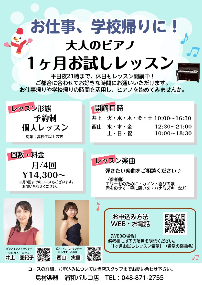 ![CONTENTS1回の受講で完結! はじめての楽典講座 受付中!講座概要開講日時担当インストラクター1ヶ月お試しレッスンのご紹介継続的なご入会をお考えの方へお問い合わせ1回の受講で完結! はじめての楽典講座 受付中! ・ピアノを始めてみたいけれど、楽譜が読めないという方・楽譜を読むのが苦手で、曲を弾 […]](https://www.shimamura.co.jp/shop/urawa/wp-content/uploads/sites/115/2026/01/20260115-f1be1b32576d26b0538c0c1a0f9288bc.jpg)