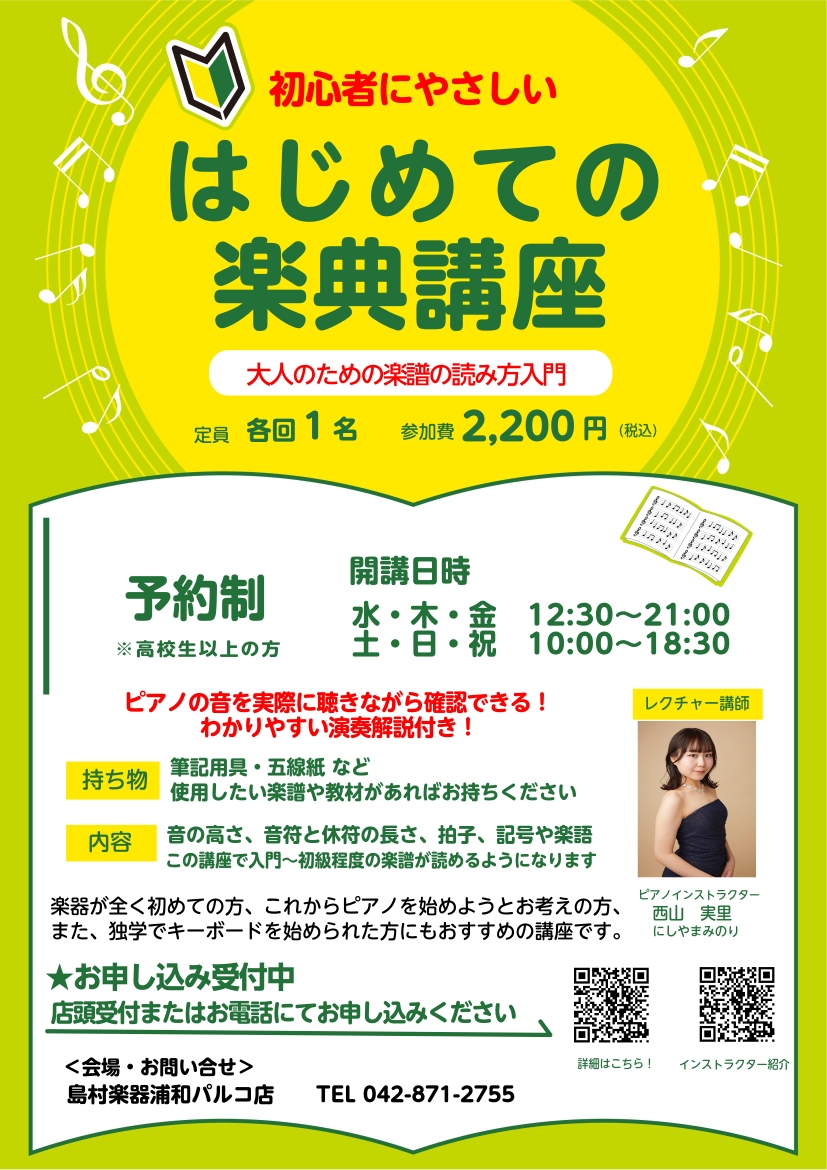 1回の受講で完結! はじめての楽典講座 受付中!