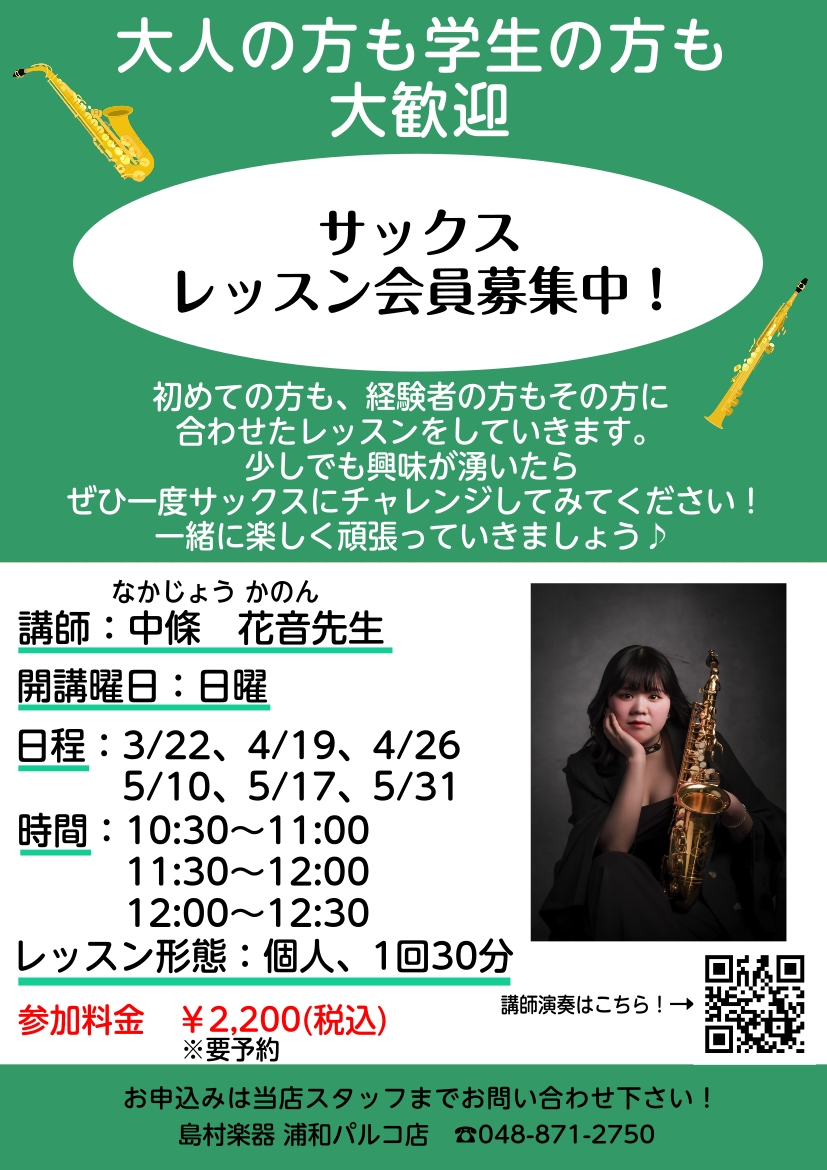 ![皆さんこんにちは!島村楽器浦和パルコ店でサックス教室会員様を大募集中です!そこで本日は日曜日のサックス講師をご紹介いたします! CONTENTS中條 花音(なかじょう かのん)先生 プロフィール中條先生の演奏動画はこちら!サックススクールのご案内体験レッスンのお申込みはこちら中條 花音(なかじょう […]](https://www.shimamura.co.jp/shop/urawa/wp-content/uploads/sites/115/2025/06/20250617-0d40a5e4a645fc6b96e767d64ac0878e-5.jpg)