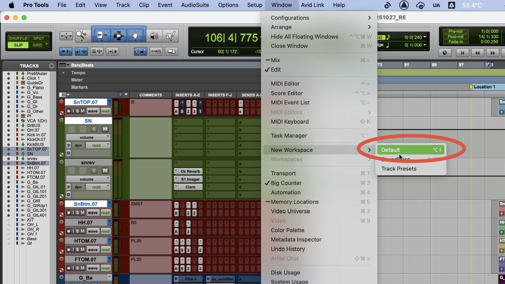 Window(ウィンドウ)〉New Workspace(新規ワークスペース)〉Default(デフォルト)