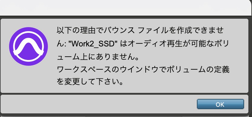 「以下の理由でバウンス ファイルを作成できません。”(HDD/SSD)”はオーディオ再生が可能なボリューム上にありません。」