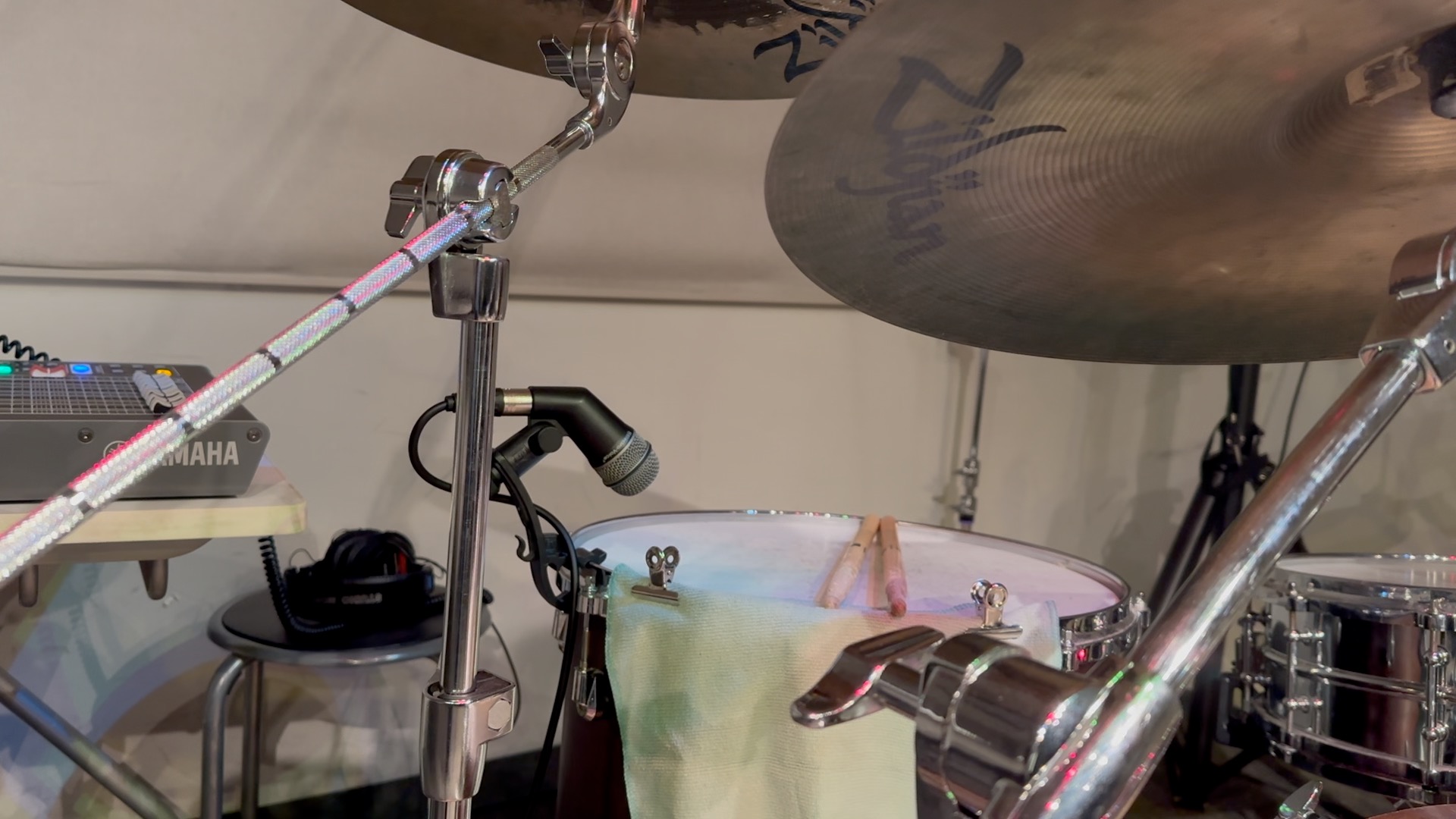 スネアの上に設置。輪郭・アタック感をしっかり捉えます。