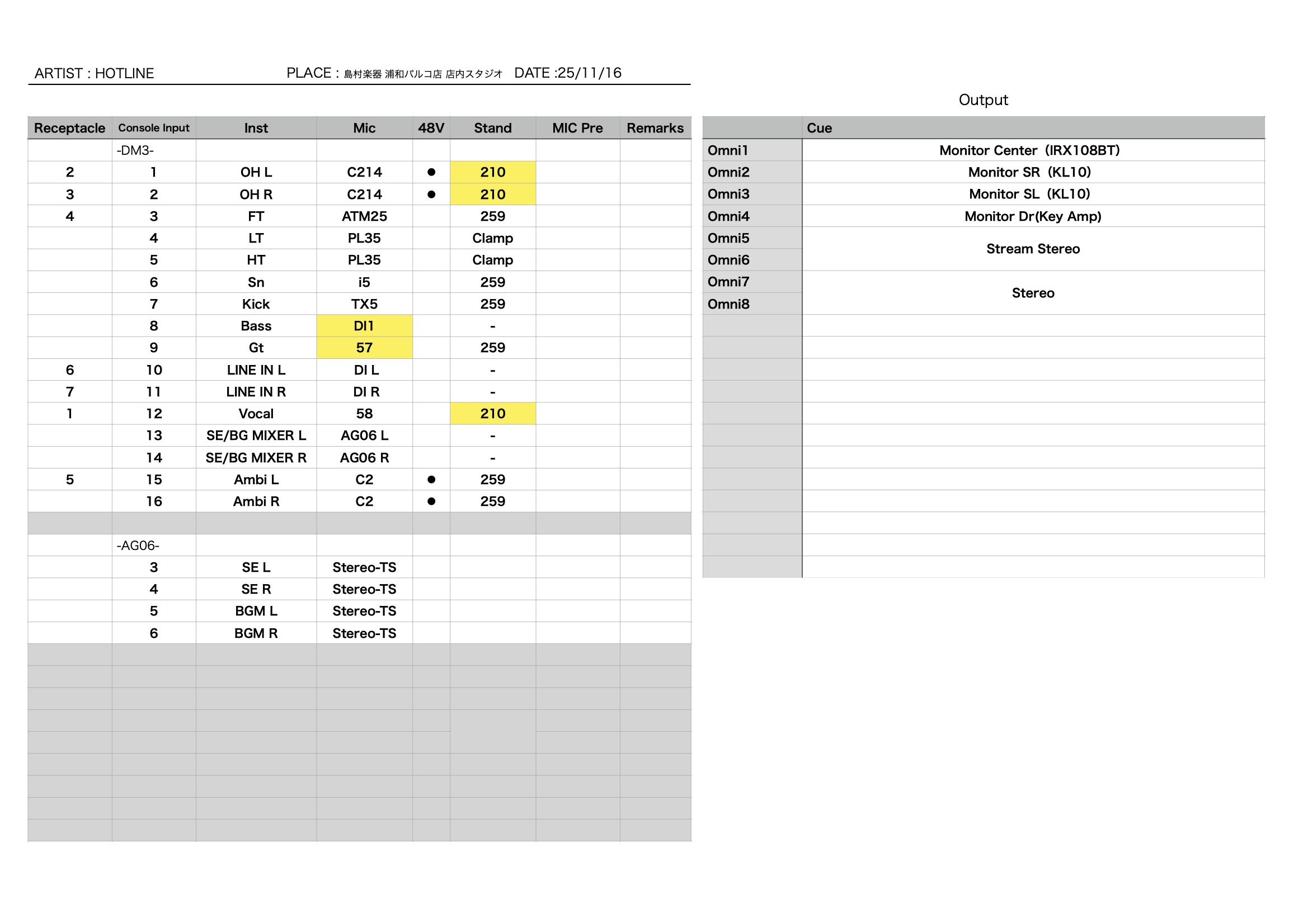 どの楽器に、どんなマイクを立てて、どんなスタンドにつけて、ミキサーのどのチャンネルに入力するか?