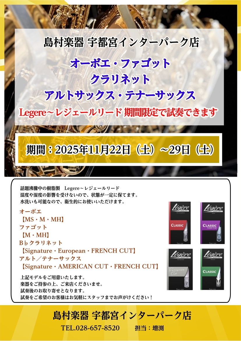 ![11/22(土)~11/29(土)の期間限定で、クラリネット・アルトサックス・テナーサックス・オーボエ、ファゴット用のレジェールの試し吹きが可能です🎷この機会にぜひ!自分に合うリードを探してみてください✨ Legere~レジェールリードとは? レジェールはカナダ生まれの樹脂製リードです!水につけてす […]](https://www.shimamura.co.jp/shop/utsunomiya-interpark/wp-content/uploads/sites/176/2025/11/20251121-shima251121-0149.jpg)
