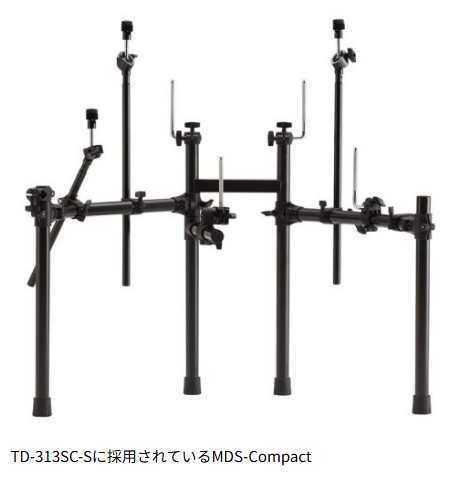 D-313SC-Sは、12インチのスネアや10インチのフロアタムといった口径の大きなサイズの標準搭載しています。TD-17SC-Sではフロアタムは8インチでしたが今回サイズアップしています。そのため、サイズ感やそれぞれの距離感などがアコースティックドラムに近い環境での練習が可能です。しかし、自宅での練習においては省スペース性も大切になります。そこで本機種ではコンパクトサイズにセッティングができるラック・スタンドMDS-Compactを採用しています。