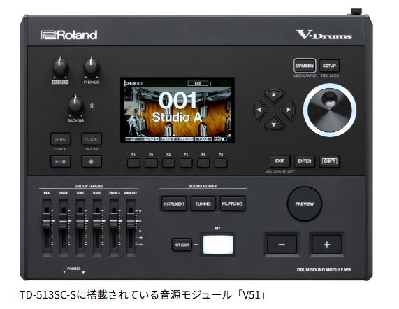 こちらはTD-27SC-Sから音源モジュールが進化しました。TD-713SC-Sにも搭載されているフラッグシップモデルV71と同じサウンド・エンジンを搭載した新たな音源モジュールV51を搭載。今まで以上の表現をお楽しみいただけます。想像力を形にするために、フェーダーやPREVIEWボタンを追加して操作性を重視。もちろんBluetoothオーディオ、Wi-Fi接続によるコンテンツのダウンロードなどの機能も搭載しています。