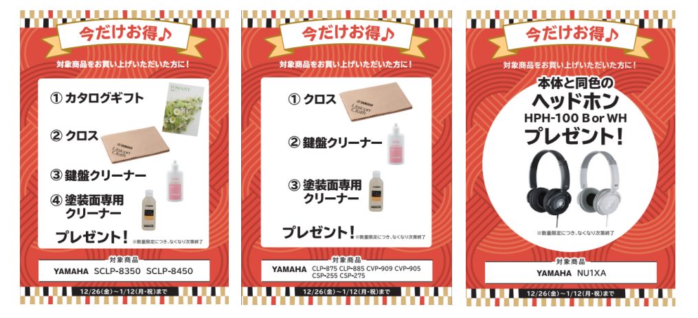 期間中ヤマハ電子ピアノご成約の方に素敵なプレゼントをご用意いたしております。