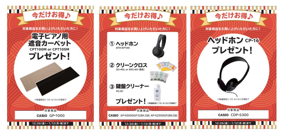 期間中カシオ電子ピアノご成約の方に素敵なプレゼントをご用意いたしております。