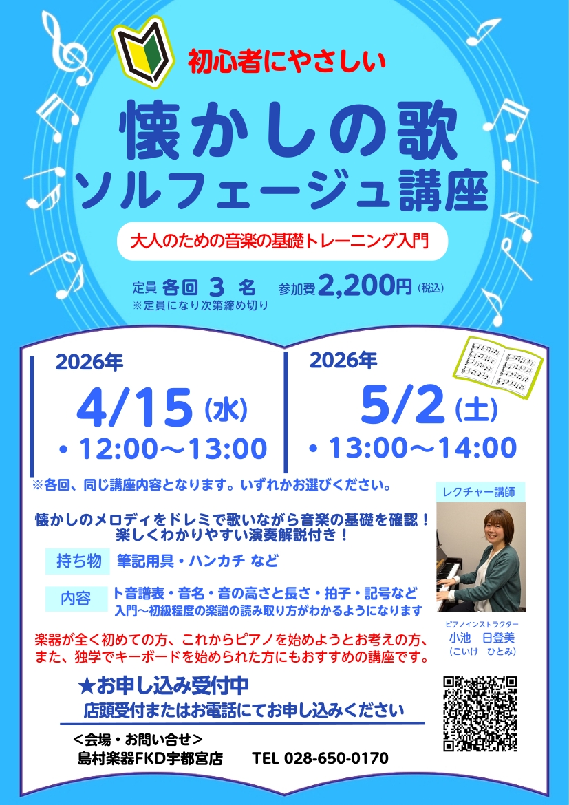 ![CONTENTS楽しく歌いながら、音楽力向上を目指しましょう【懐かしの歌 ソルフェージュ講座】詳細【講座当日にお持ちいただくもの】担当講師紹介お問い合わせ・お申し込みはこちら楽しく歌いながら、音楽力向上を目指しましょう 皆さま、こんにちは。ピアノインストラクターの小池です。 音符をスラスラ読んだり正 […]](https://www.shimamura.co.jp/shop/utsunomiya/wp-content/uploads/sites/9/2026/02/20260328-04d6d54971fba489d815b4f70b85f145.jpg)