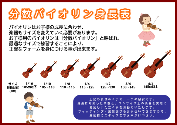 分数バイオリンは、お子さまの身長や腕の長さに合ったサイズで、無理のない姿勢で弾けるようにするためのものです。