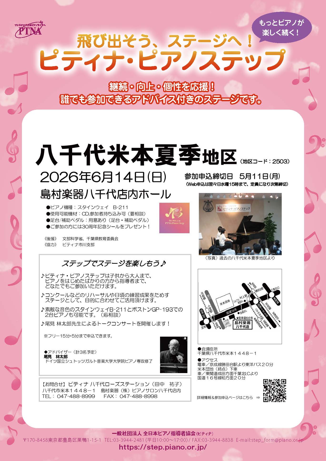 ![ピティナ・ピアノステップは皆さんを応援するステージです!いつでもどなたでも参加でき、アドバイスがもらえます。 ステップは全国で年間を通して580地区で開催されています。経験豊富なピアニスト・ピアノ指導者である先生方より、「ステップ・アドバイザー」が、あなたの演奏を聴いて直筆でアドバイスを贈ります。 […]](https://www.shimamura.co.jp/shop/yachiyo/wp-content/uploads/sites/110/2022/04/20250530-img_4882.jpg)