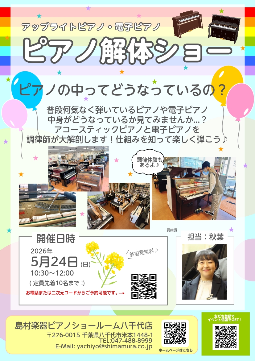 ![『電子ピアノとアップライトピアノを解体します!!』 皆さんは電子ピアノやアップライトピアノの中身を見たことがありますか?? 特に電子ピアノの中身を見ることは少ないと思います。 今回は、なかなか見られない電子ピアノの中身と、アップライトピアノの中身を大解剖します...! さらに、調律体験やピアノクイズ […]](https://www.shimamura.co.jp/shop/yachiyo/wp-content/uploads/sites/110/2024/10/20260110-20241022-11.jpg)