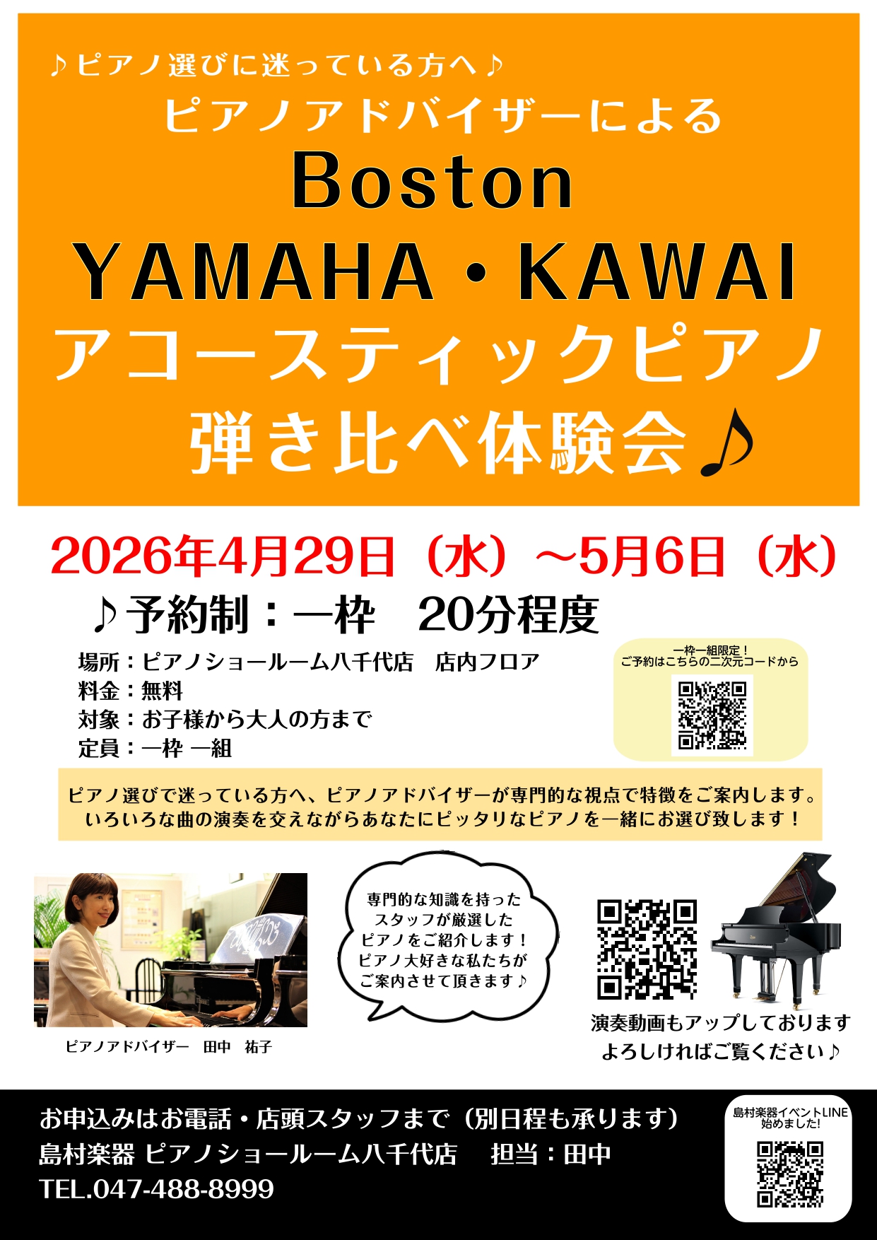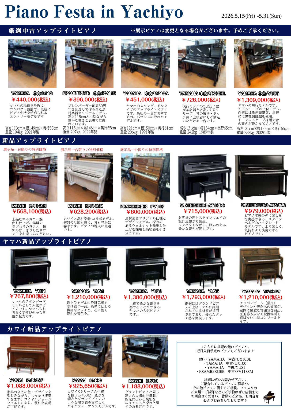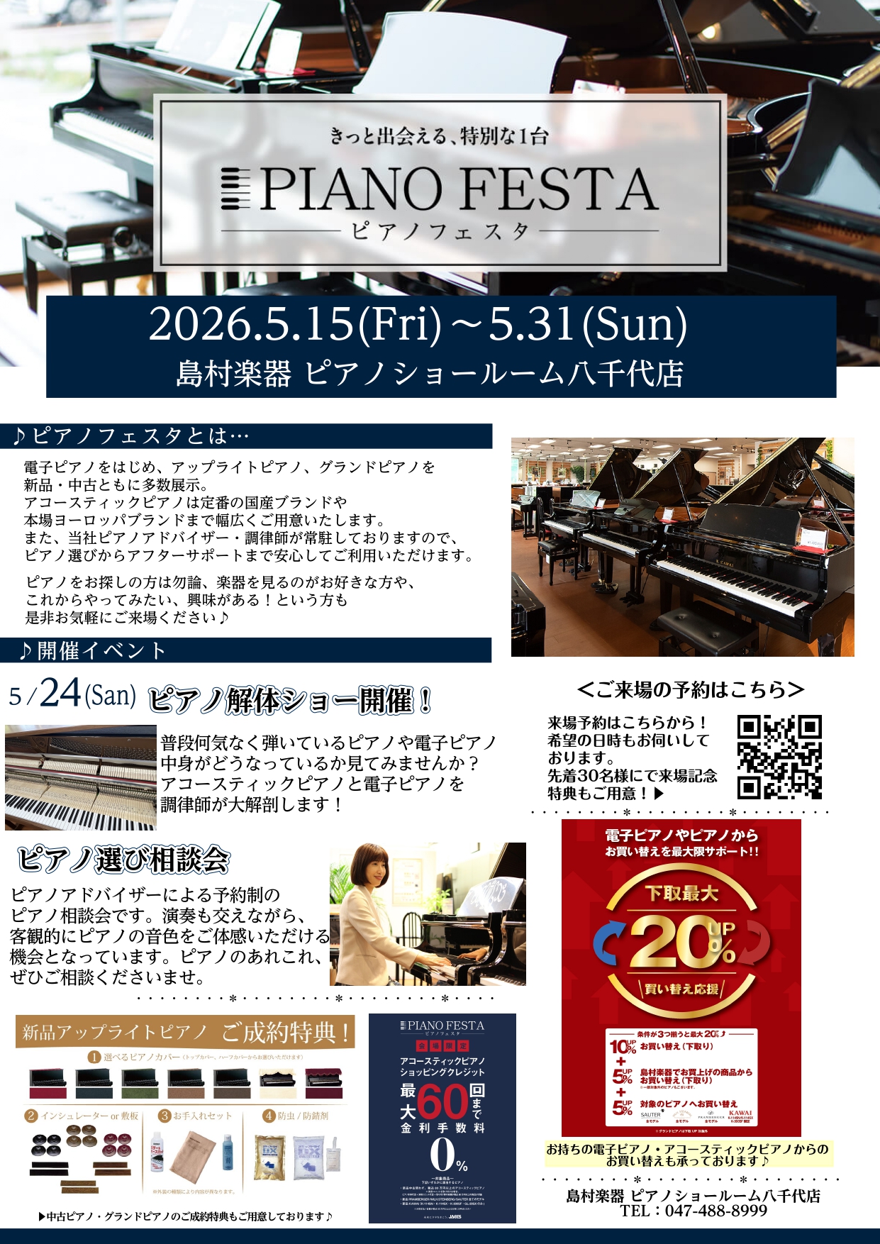日頃は、島村楽器をご愛顧頂き誠にありがとうございます。この度夏のピアノフェスタの開催が決定いたしましたのでご案内いたします! 島村楽器千葉県店舗合同企画、PIANO FESTA 2026 in 八千代(千葉県八千代市)として開催いたします。100台を超えるアコースティックピアノ&電子ピアノが皆様との […]