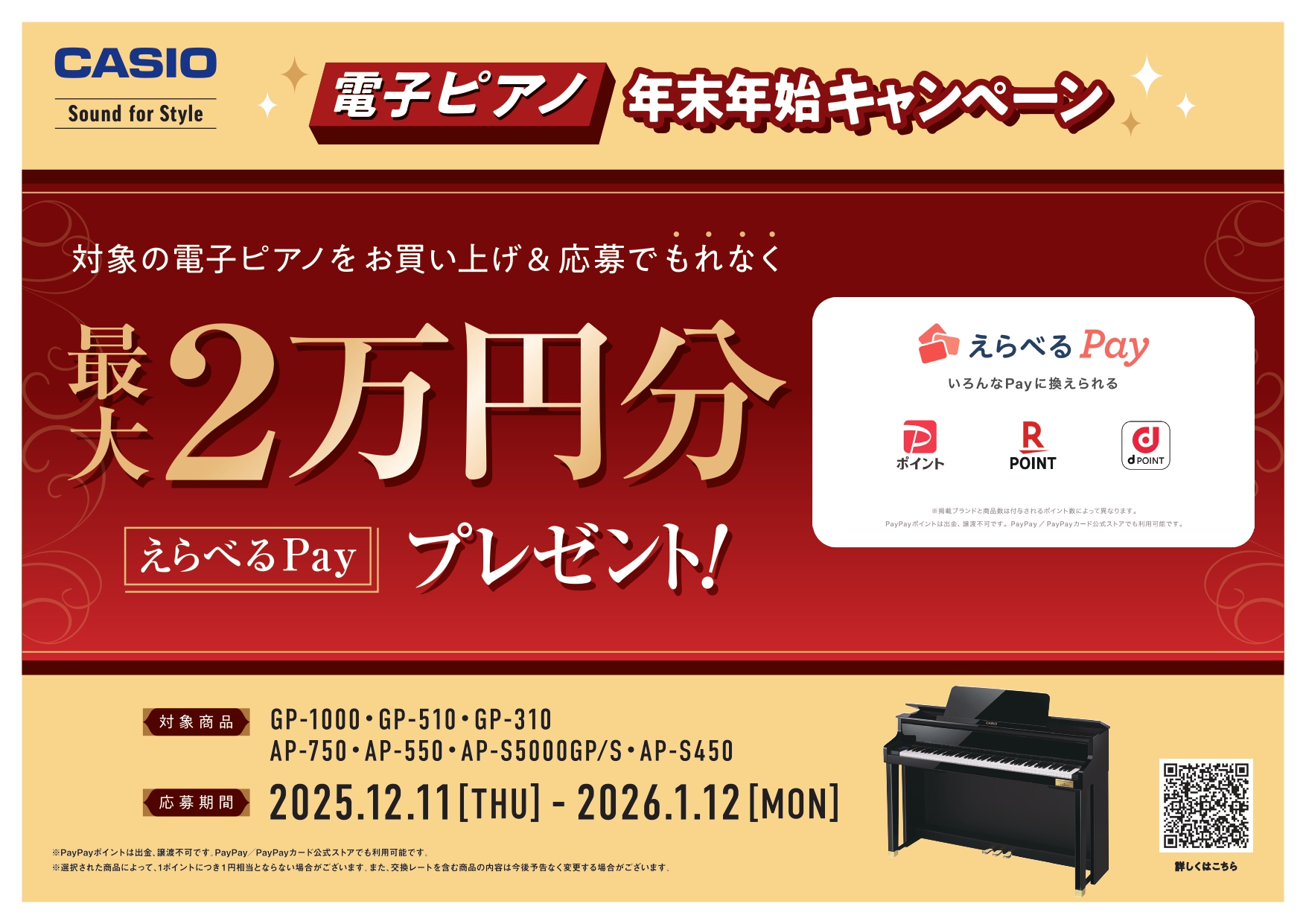 CASIO 年末年始キャンペーン開始!!電子ピアノお買い上げで「えらべるPay」プレゼント!
