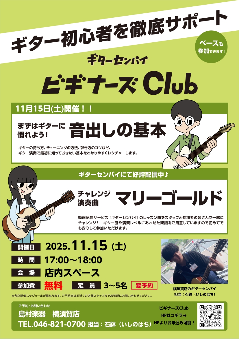 ビギナーズClub担当の石鉢です!ギターを始めるにあたり知っておくと助かる知識や演奏のコツの数々を無料でレクチャー致します。ご参加お待ちしております!