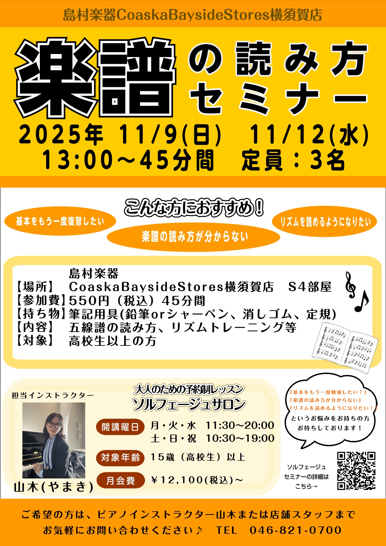 ![こんにちは。横須賀店ピアノインストラクター山木です。・楽譜が読めるようになりたい・リズムが読めるようになりたい・レッスンには通っているけれど楽譜の読み方に自身がない、、、上記でお悩みの方、朗報です!このセミナーは基本的な内容を確認する内容になりますので、普段楽器を演奏しているけれど正直不安なところが […]](https://www.shimamura.co.jp/shop/yokosuka/wp-content/uploads/sites/40/2025/10/20251007-shima251007-0170.jpg)