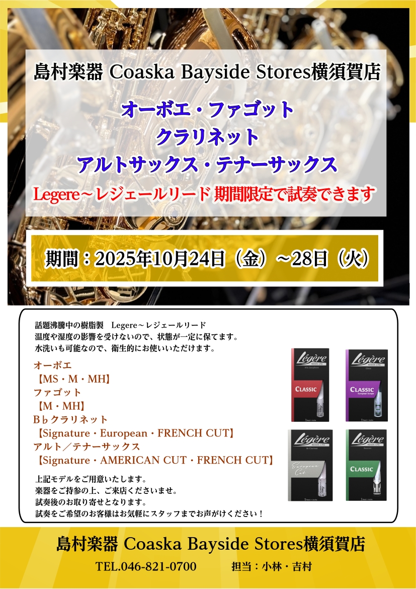 みなさまこんにちは、横須賀店の管楽器担当、小林・吉村です♪ かねてよりお問合せを頂いておりました!レジェールリードの試奏会をようやく開催いたします…!!!10/24㈮~28㈫の期間限定で、クラリネット・アルトサックス・テナーサックス・オーボエ、ファゴット、イングリッシュホルン用の試し吹きが可能です🎷 […]