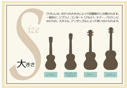 ウクレレには代表的なサイズとしてソプラノ、コンサート、テナー、バリトンの4つ種類がございます。