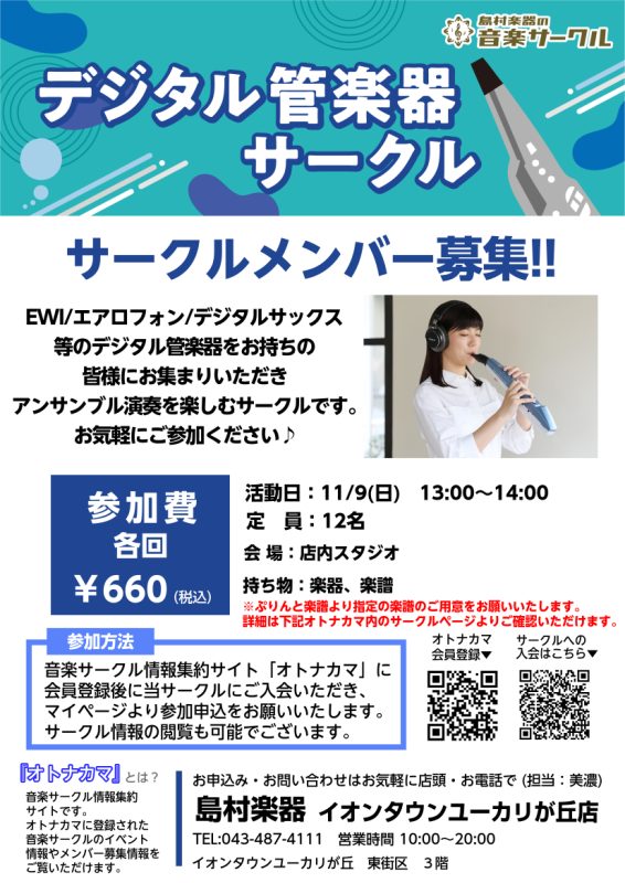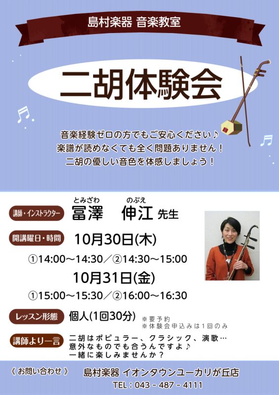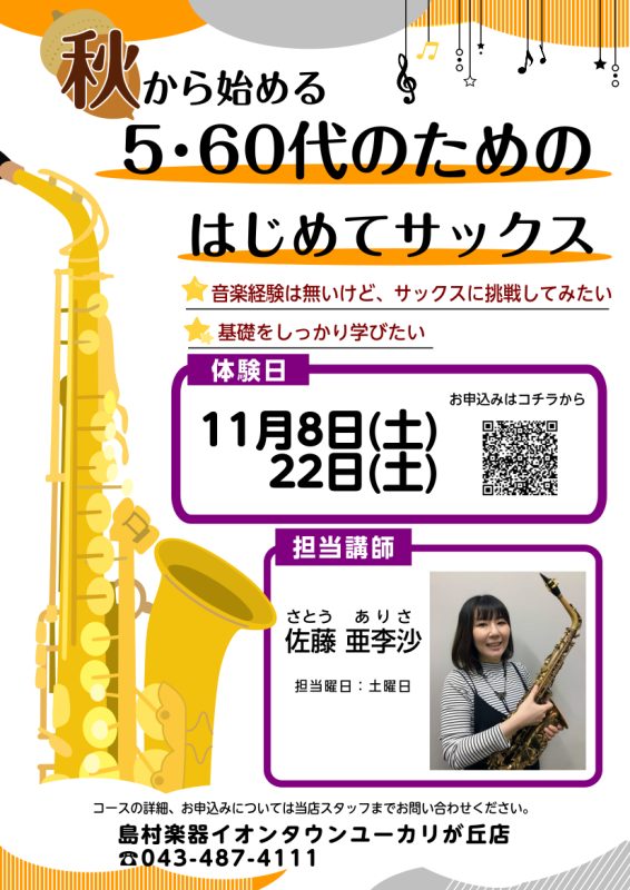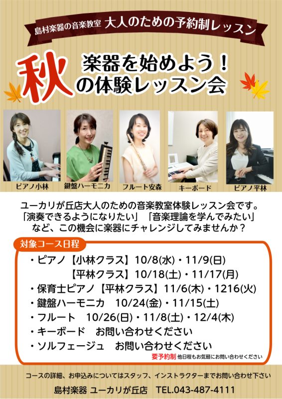 ![CONTENTS大人のための予約制レッスン 体験レッスンみんなで楽しむライブイベントHOT LINE10/26(日) 大人のピアノ弾き語りサークル10/30(木)・31(金) 二胡体験会鍵盤ハーモニカサークル11/8(土)・22(土) サックス体験レッスンDAY11/9(日) デジタル管楽器サークル […]](https://www.shimamura.co.jp/shop/yukari/wp-content/uploads/sites/37/2023/06/20230601-image2-27.png)