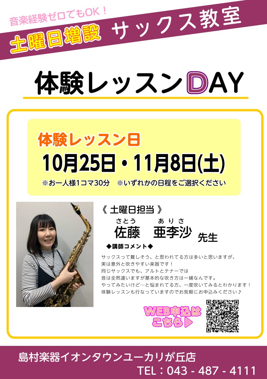 ![CONTENTS《新規開講》佐藤 亜李沙(さとう ありさ) 担当曜日:土曜日講師プロフィール講師インタビュー講師からのコメントコース概要お問い合わせ《新規開講》佐藤 亜李沙(さとう ありさ) 担当曜日:土曜日 講師プロフィール 中学生よりサックスを始める。名古屋芸術大学演奏科卒業。クラシックサックス […]](https://www.shimamura.co.jp/shop/yukari/wp-content/uploads/sites/37/2024/06/20250927-1f077bb6b9a600bcbffefa895ac76603.jpg)