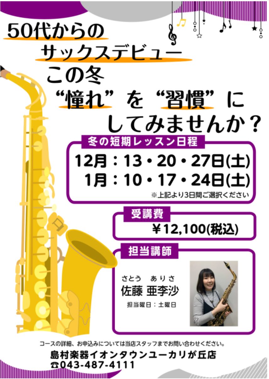 | コース名 | サックス教室 冬の短期レッスン |